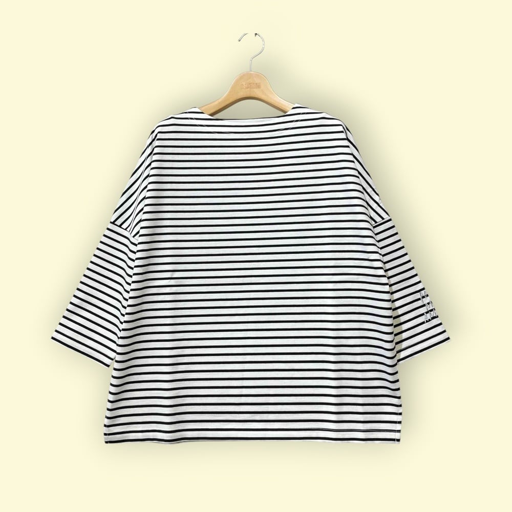 横に広く開いたボートネックが特徴で、