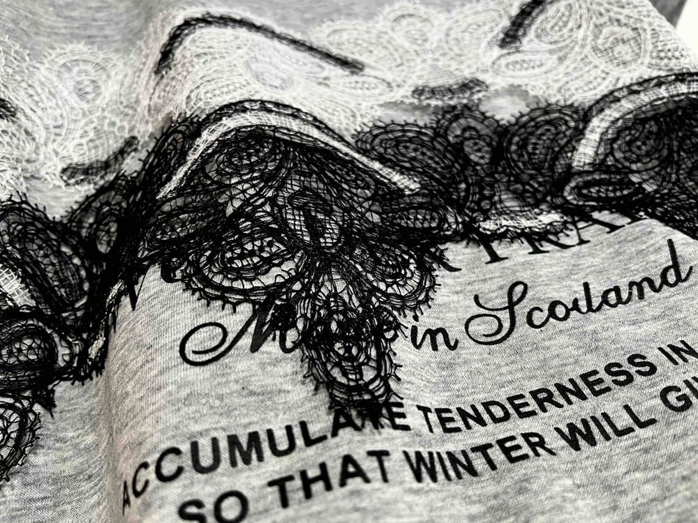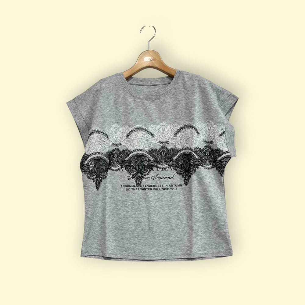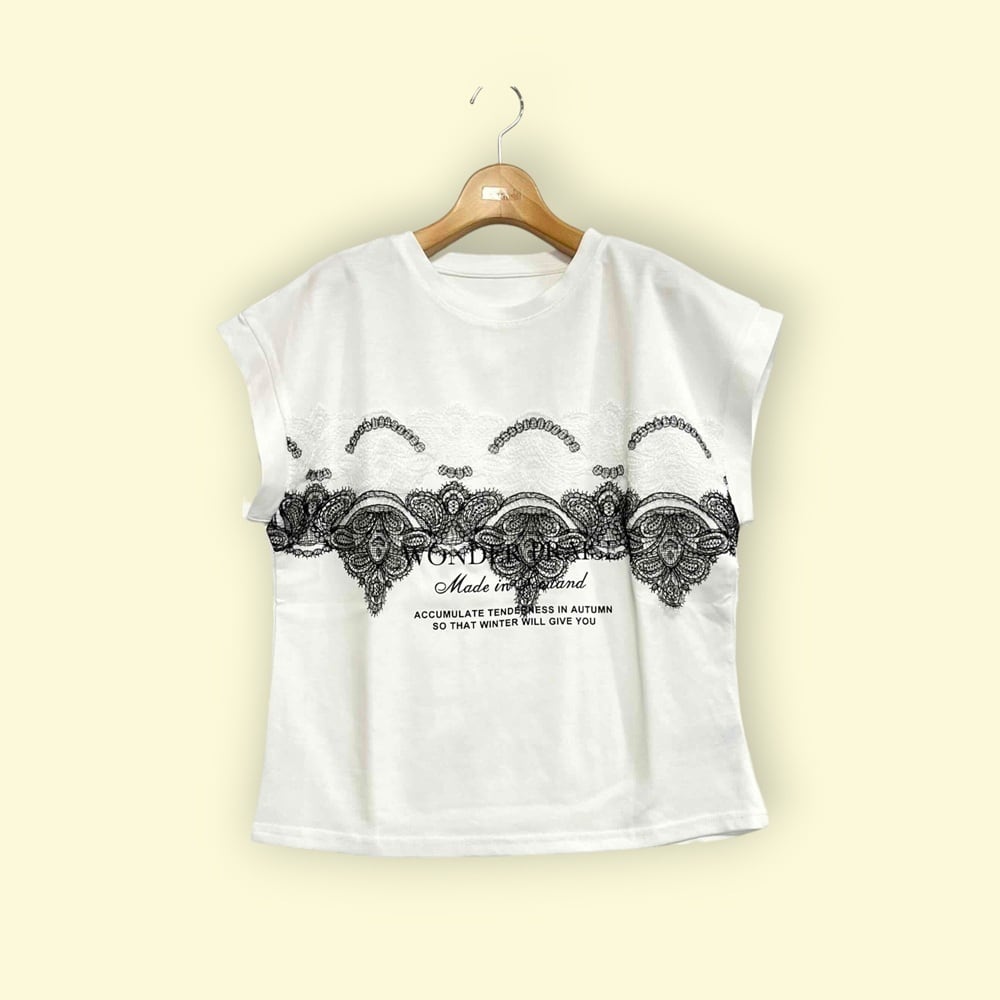 英字プリントに繊細なレースを重ねた